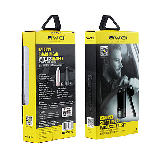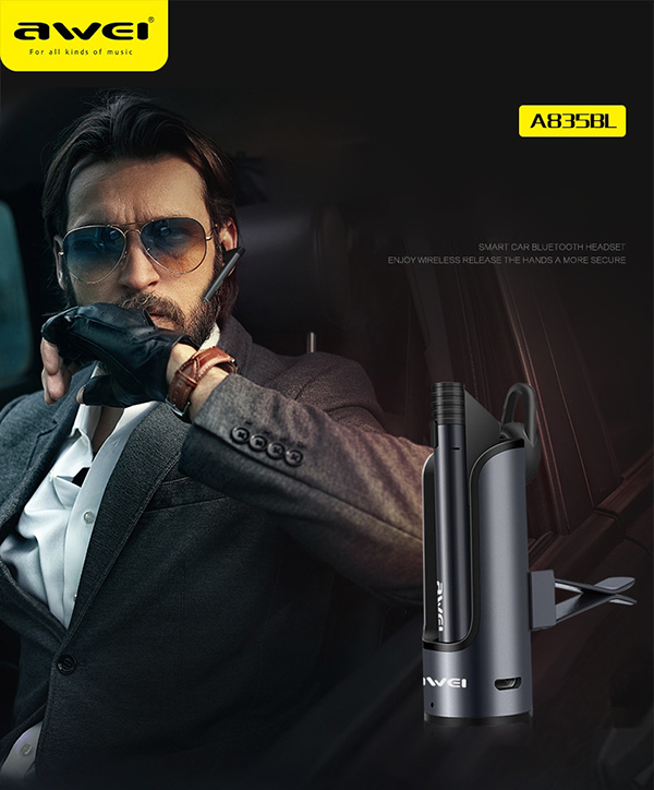 Awei A835BL – lekki i trwały bezprzewodowy zestaw słuchawkowy Bluetooth. Ładowarka została wyposażony w zaczep pozwalający umięścić go w najwygodniejszym miejscu w naszym samochodzie. Uchwyt magnetyczny mocno trzyma zestaw słuchawkowy podczas ładowania lub w trybie głośnomówiącym. Wygodne w noszeniu, miękkie nauszniki z gumy zostały zaprojektowane z myślą o noszeniu przez długi czas.