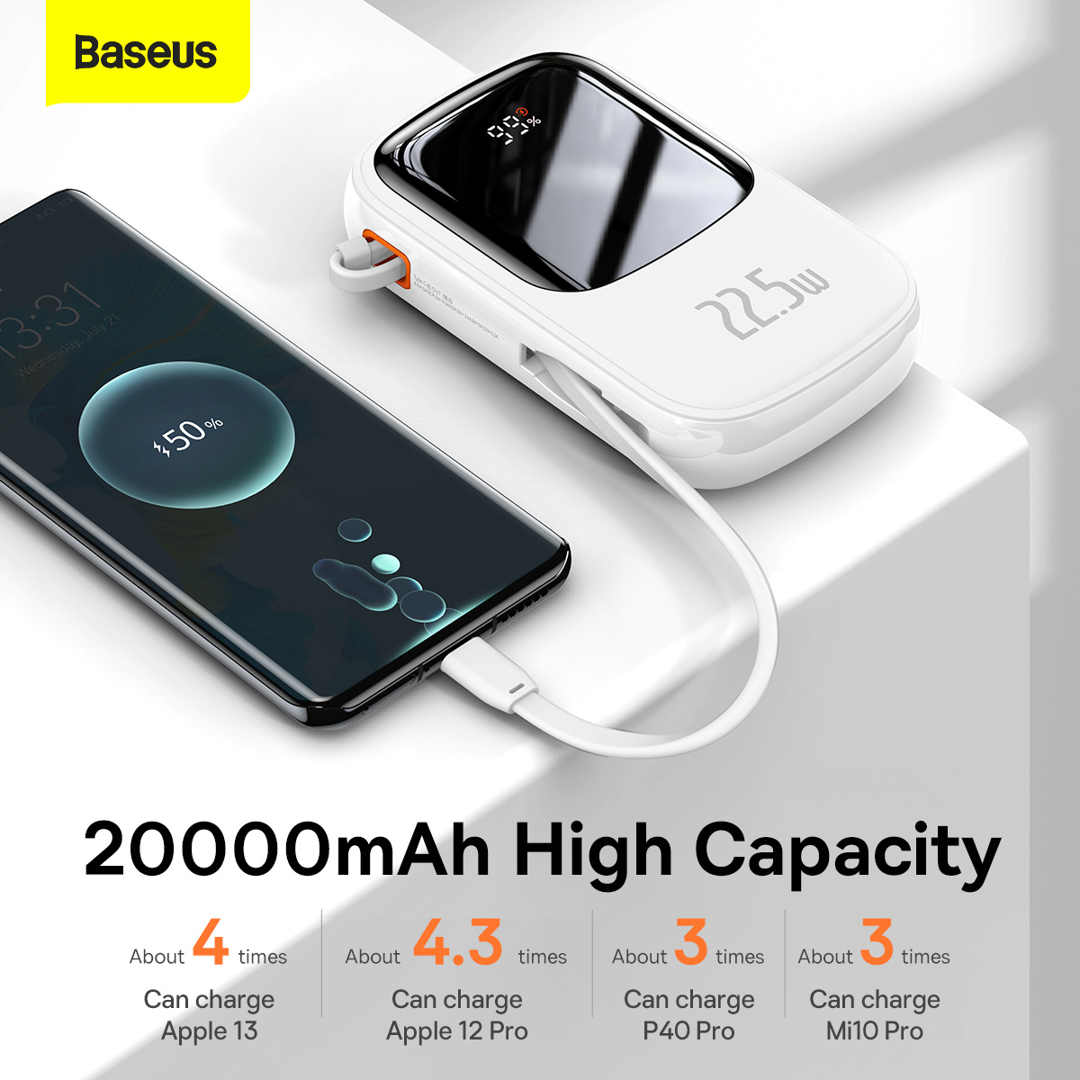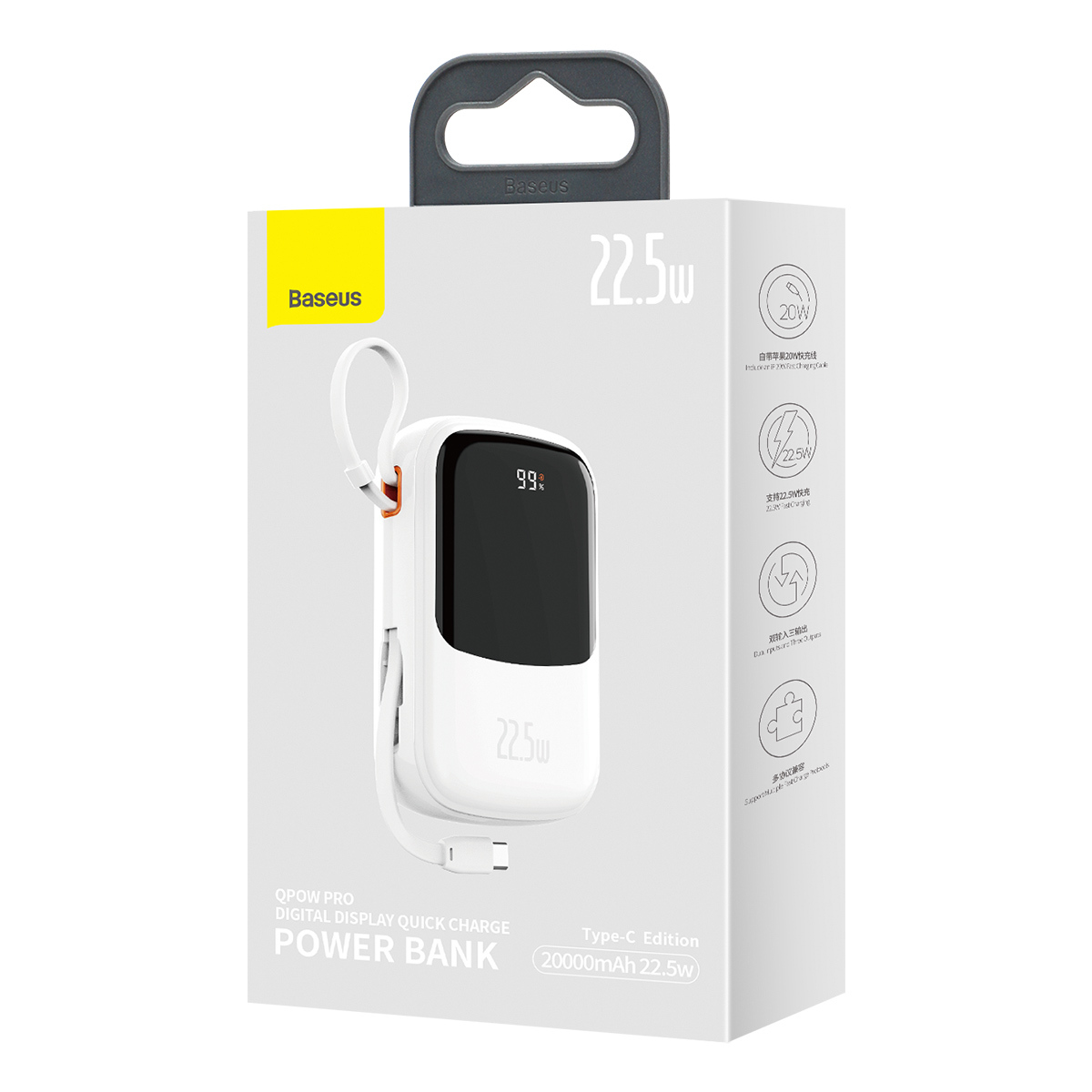 Baseus Power Bank 20000mAh Qpow Pro – USB + Typ C – PD 22,5W z kablem Typ C (PPQD060302) biały
