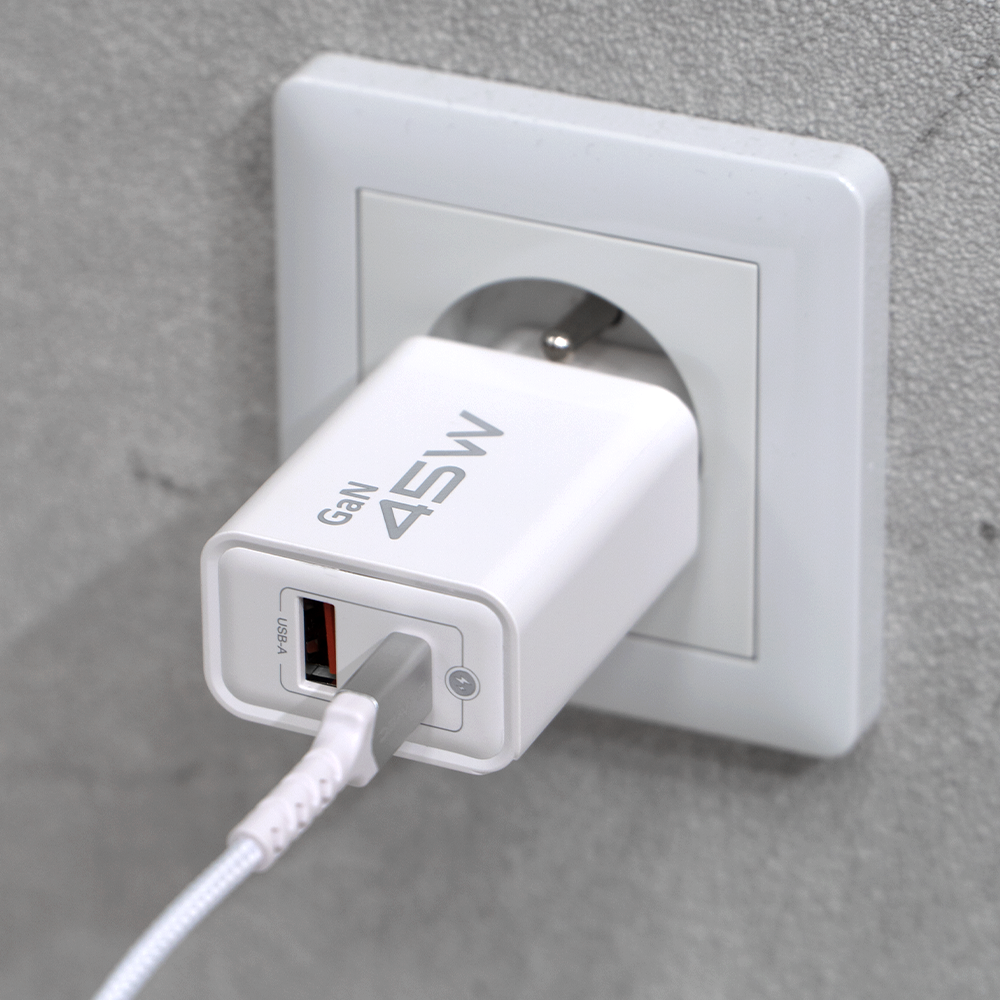 Zapewnia moc 45W, co umożliwia szybkie ładowanie urządzeń, nawet tych o większym zapotrzebowaniu energetycznym, w krótkim czasie.