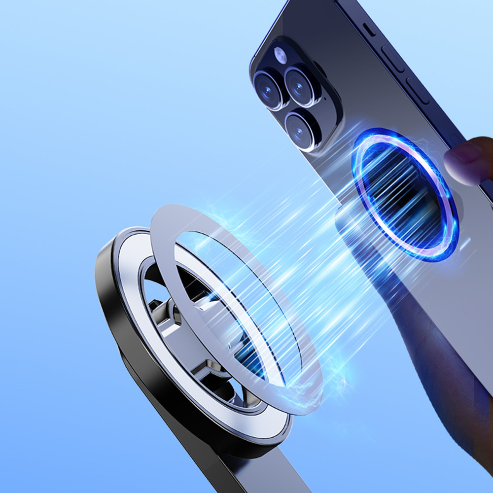Uchwyt obsługuje MagSafe i zawiera metalową blaszkę do telefonów bez tej funkcji. W komplecie znajduje się także regulowany uchwyt pasujący do większości smartfonów – od 6 do 9,5 cm szerokości.