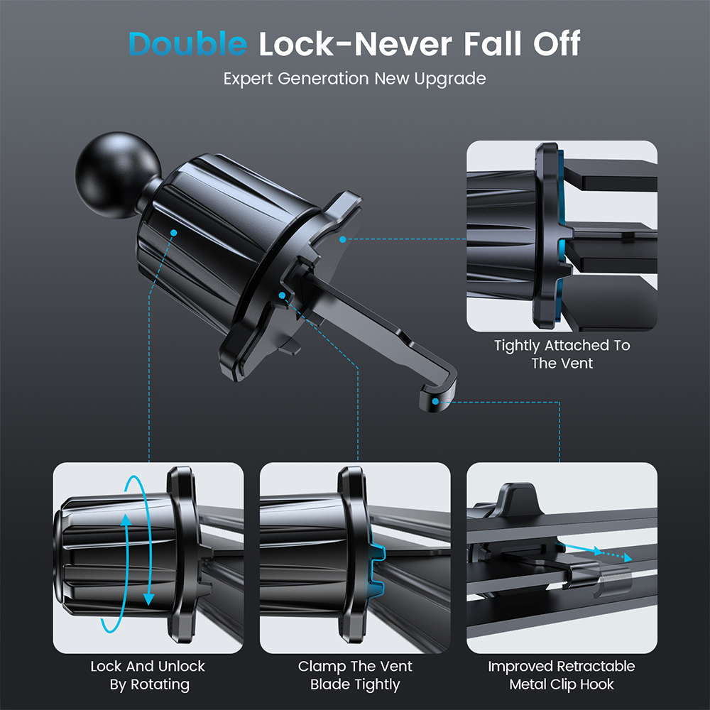 - Specjalnie zaprojektowany haczyk – Blokuje uchwyt na kratce nawiewu, zapewniając stabilność i brak luzów.