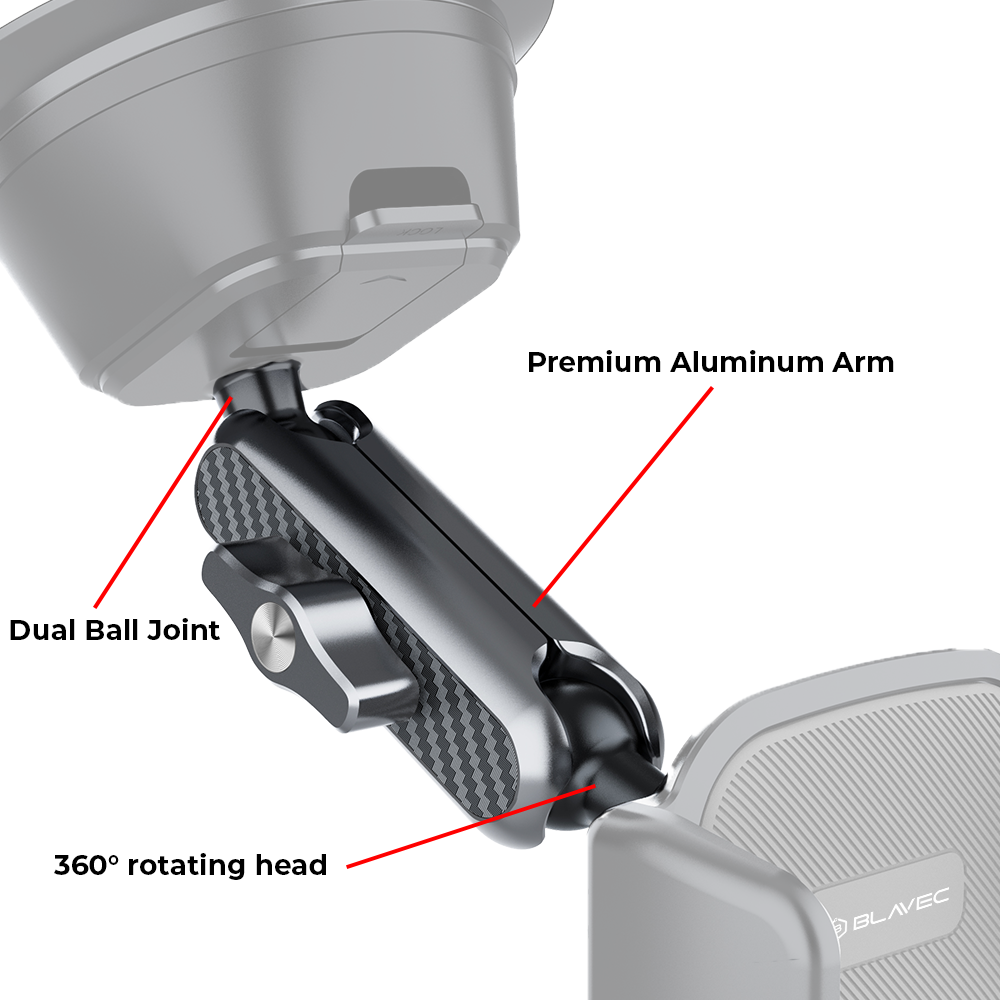 - Aluminiowe ramię (8 cm) z podwójnym przegubem kulowym – Umożliwia regulację kąta widzenia telefonu i położenia ramienia, zapewniając idealne dopasowanie.