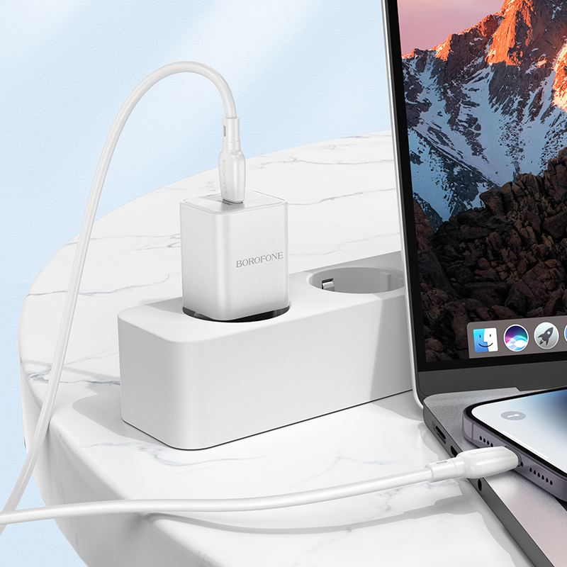 Borofone Ładowarka sieciowa BN13 Safety GaN – Typ C – PD 30W z kablem Typ C na Lightning biała