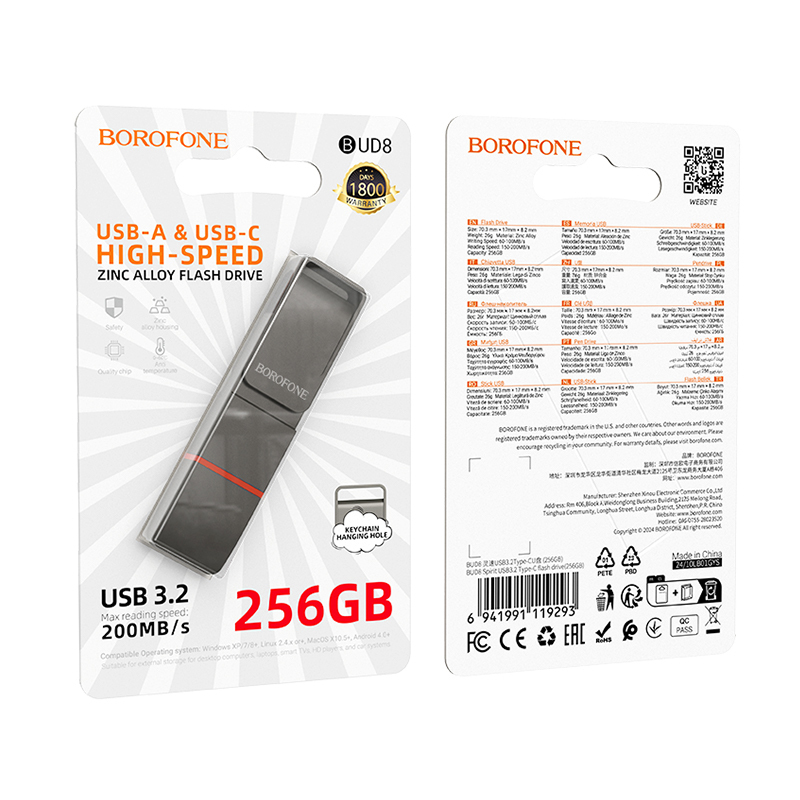 Borofone BUD8 Spirit to nowoczesny pendrive o pojemności 256GB, wyposażony w podwójny interfejs USB 3.2 + Type-C, co zapewnia maksymalną wszechstronność i szybkie przesyłanie danych.