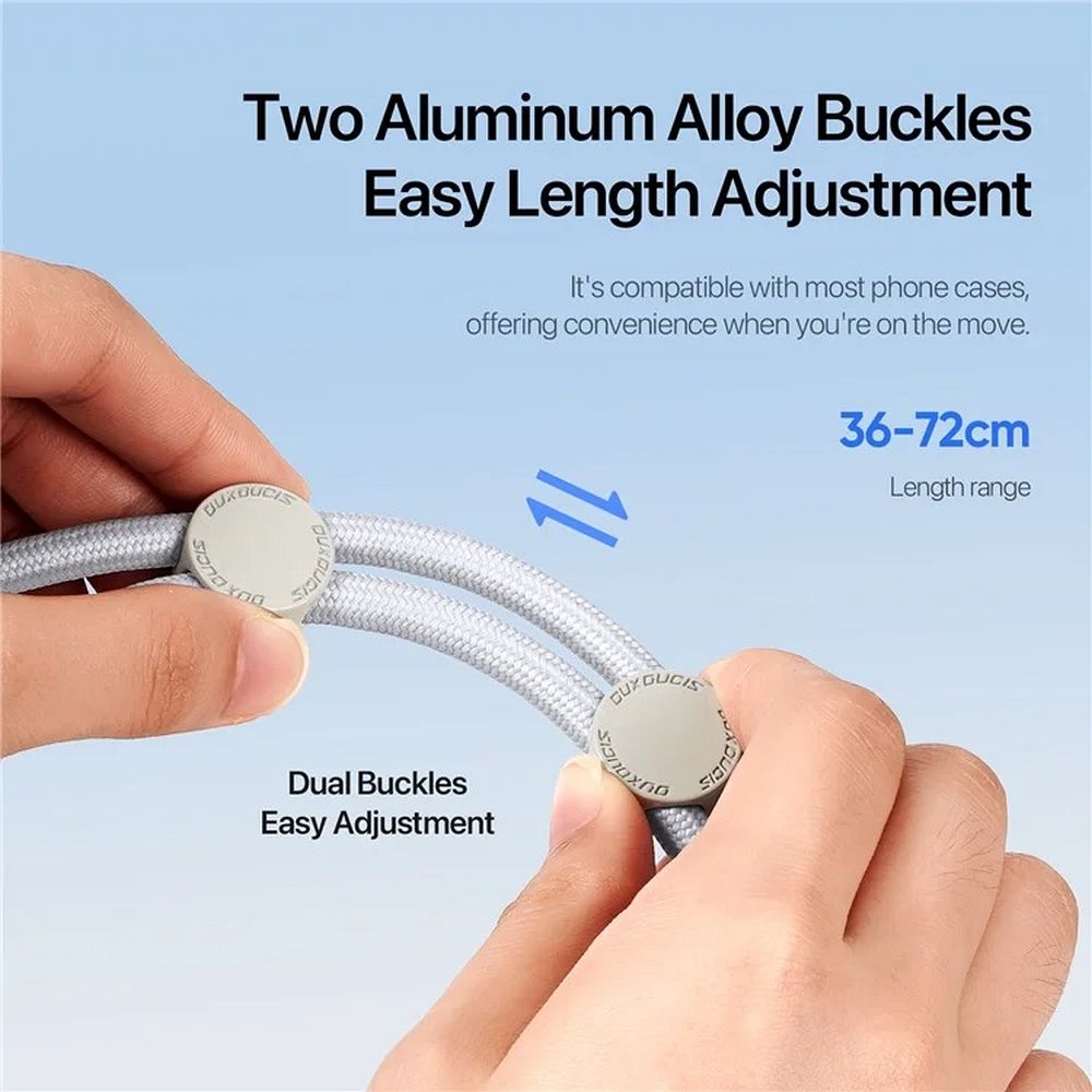 Smycz DUX DUCIS Plaz oferuje możliwość łatwej regulacji długości w zakresie od 36 do 72 cm, dzięki czemu jest odpowiednia dla osób o różnym wzroście i preferencjach co do stylu noszenia. To sprawia, że smycz jest niezwykle uniwersalna, zapewniając komfort w codziennym użytkowaniu, zarówno podczas spacerów, jak i aktywności fizycznych. Dwie klamry wykonane ze stopu aluminium gwarantują solidne trzymanie i bezpieczeństwo telefonu.