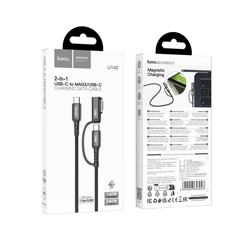 1. Length: 1.8m 2. Material: braided wire + aluminum alloy 3. Wire core: 70/0.1×2+16/0.08×3 OD4.2mm 4. Type-C to Type-C supports 240W (48V/5A) charging 5. Type-C to MagSafe 3 supports Apple MacBook computer magnetic charging 140W (28V/5A) 6. Type-C to Type-C supports data transmission
