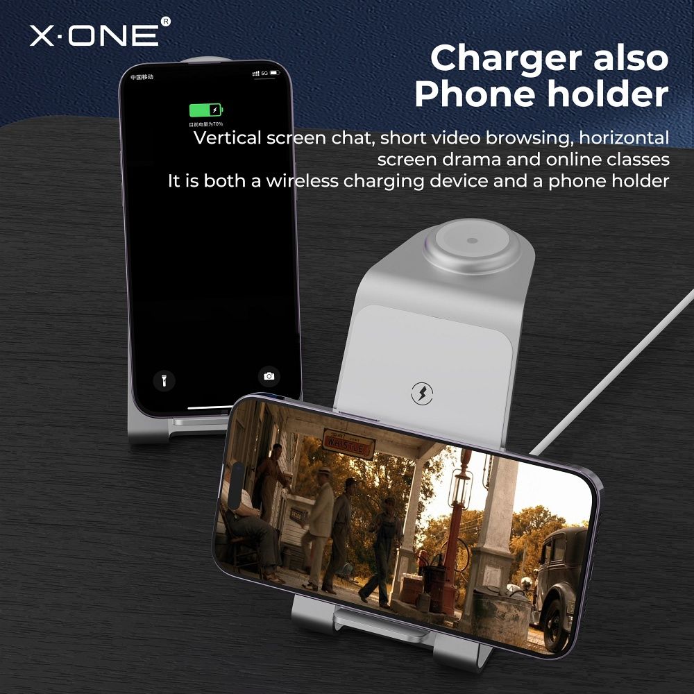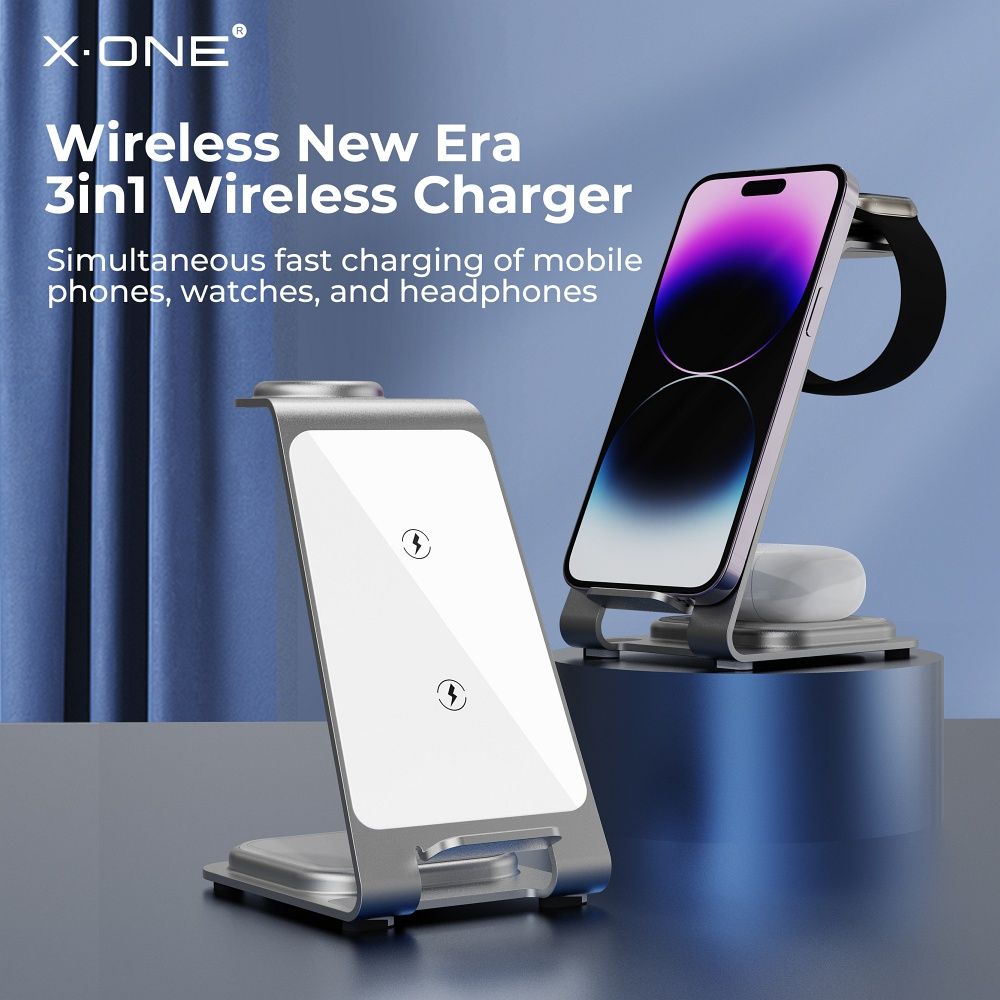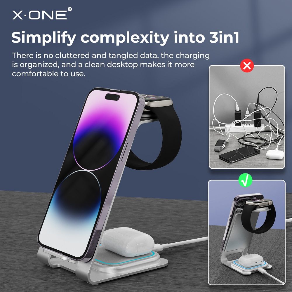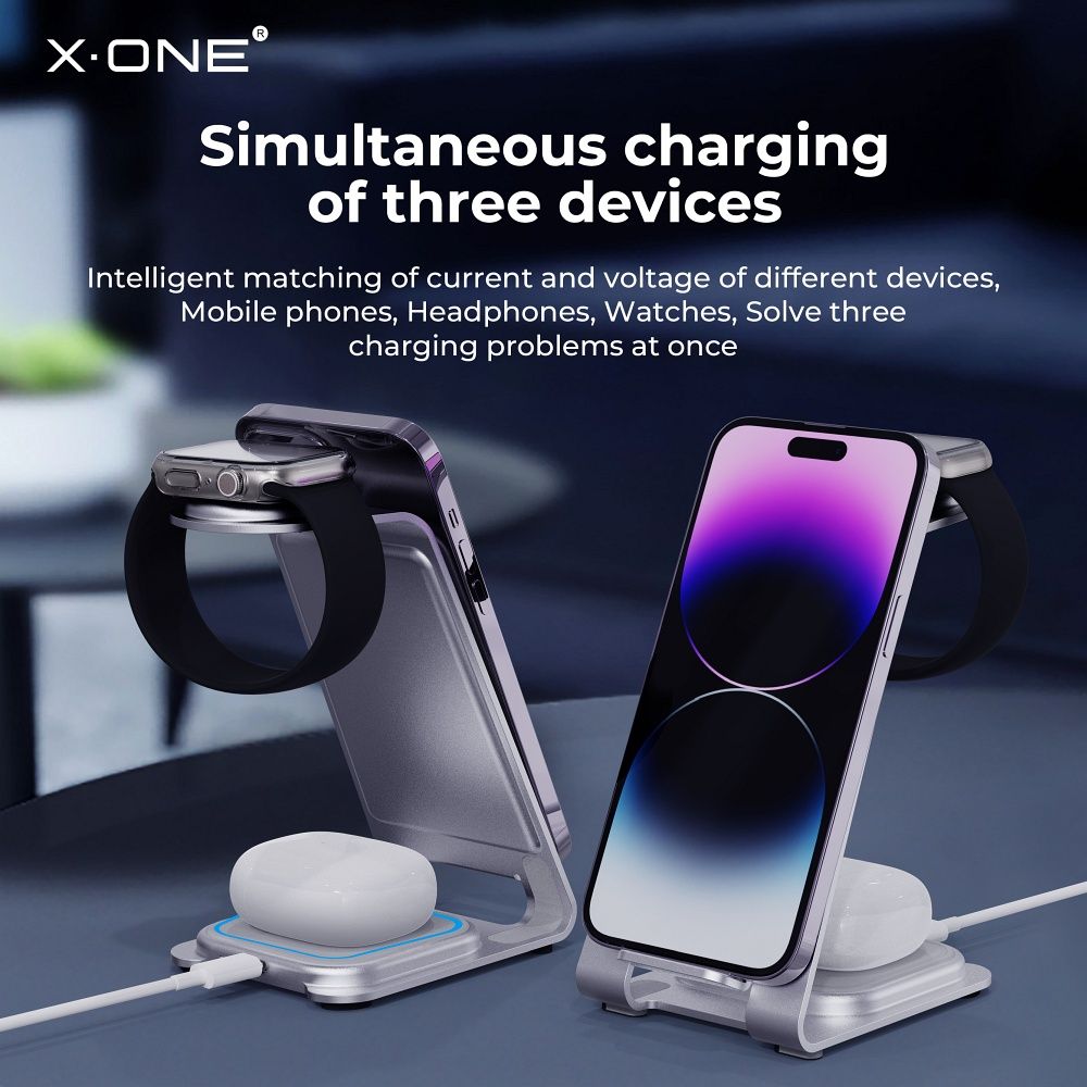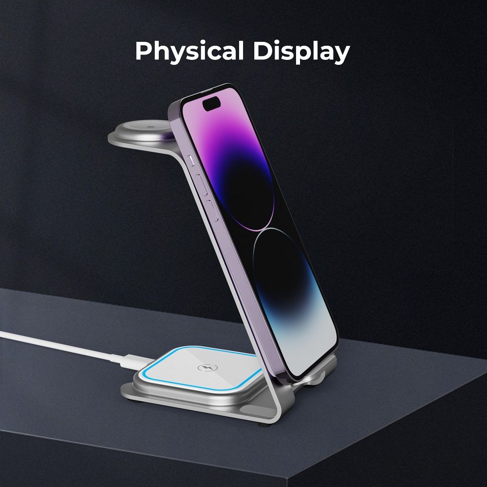 Ładowarka bezprzewodowa 3w1. Pozwala na ładowanie indukcyjne telefonu, zegarka smartwatch, zestawów słuchawkowych TWS. Wspomaga ładowanie z MagSafe. Przeznaczona dla urządzeń o zapotrzebowaniu na moc do 15W.