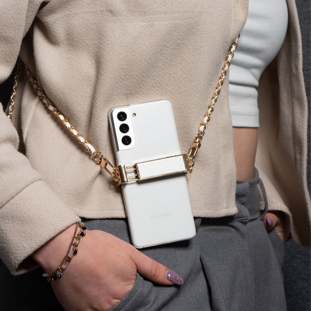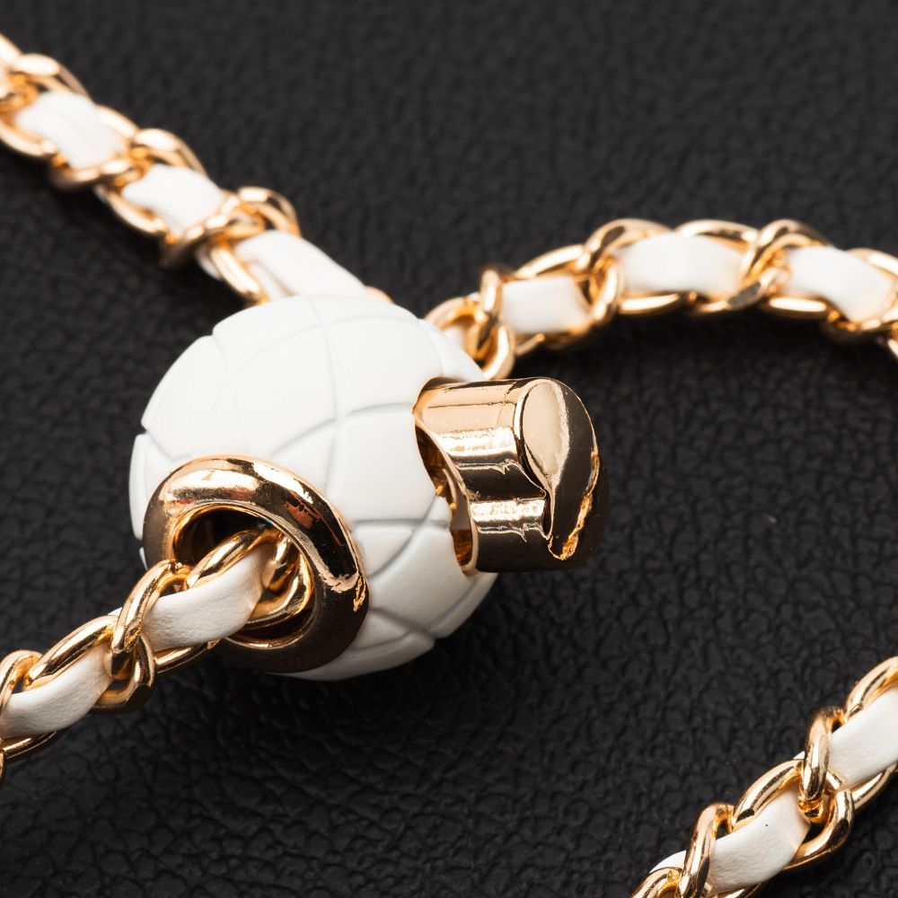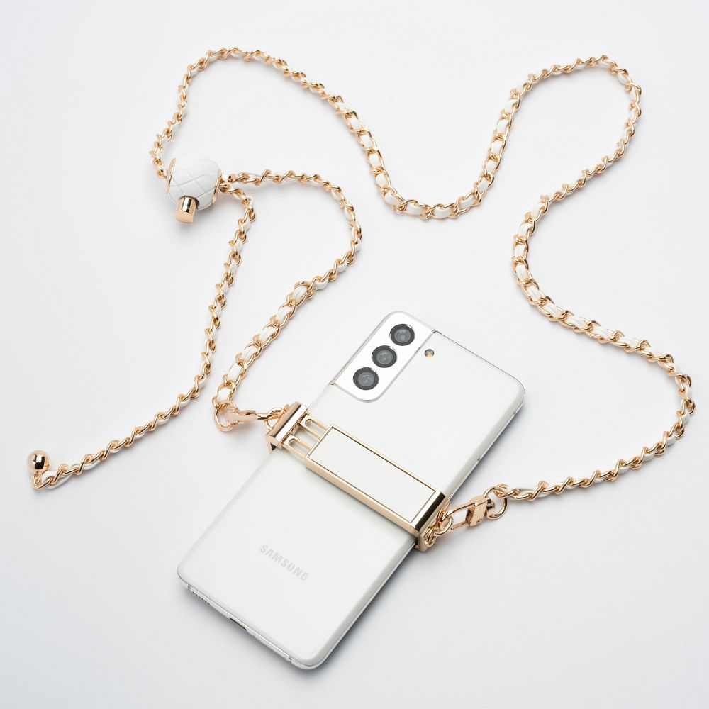 Produkt wykonany z połączenia metalowego łańcuszka i plecionej skóry PU stanowi nowoczesny dodatek do każdego telefonu. Wykończenia w kolorze złota oraz ozdobna kulka regulacyjna nadają mu eleganckiego charakteru i pozwalają dopasować długość smyczy do potrzeb użytkownika – do noszenia przez ramię lub na szyi.