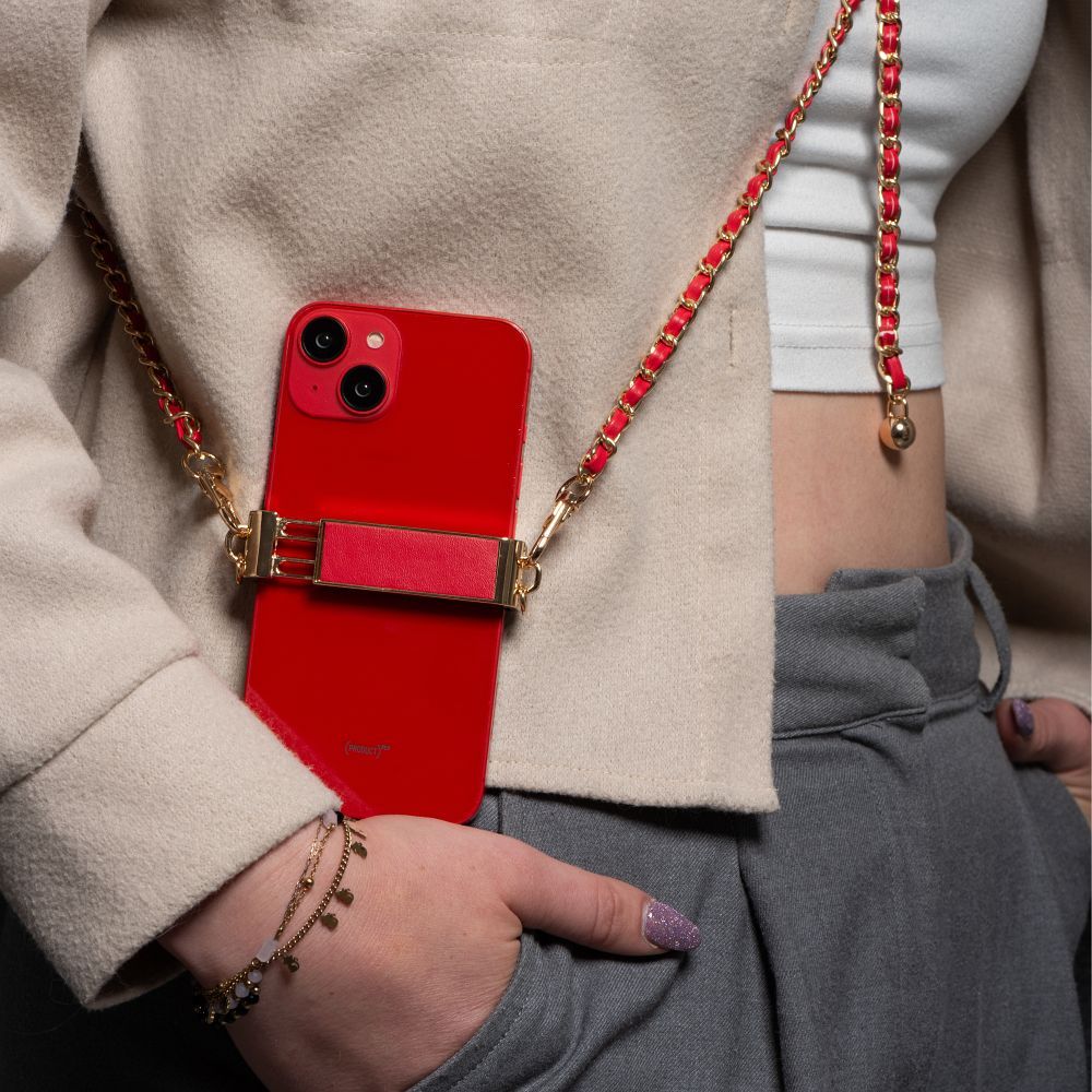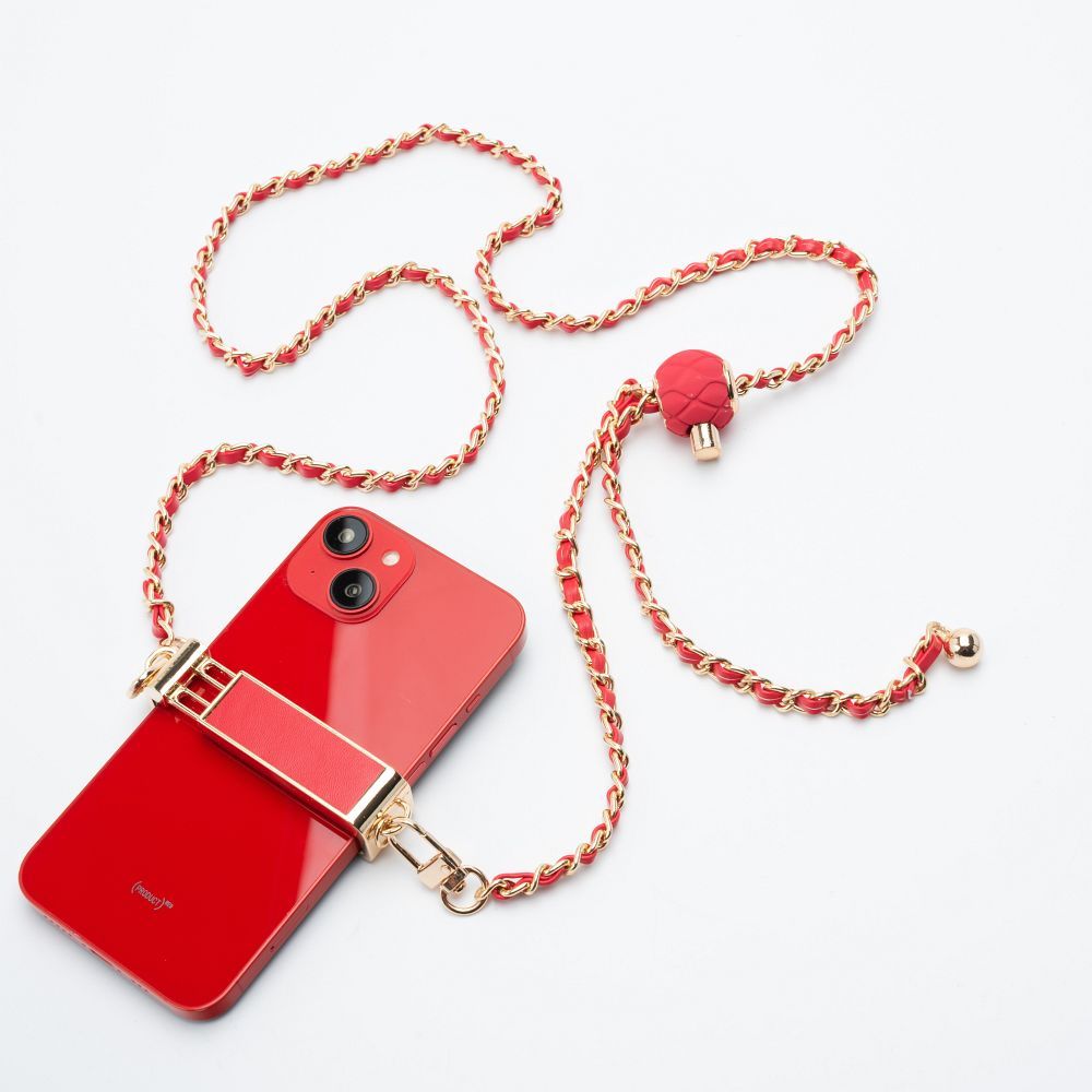 Produkt wykonany z połączenia metalowego łańcuszka i plecionej skóry PU stanowi nowoczesny dodatek do każdego telefonu. Wykończenia w kolorze złota oraz ozdobna kulka regulacyjna nadają mu eleganckiego charakteru i pozwalają dopasować długość smyczy do potrzeb użytkownika – do noszenia przez ramię lub na szyi.