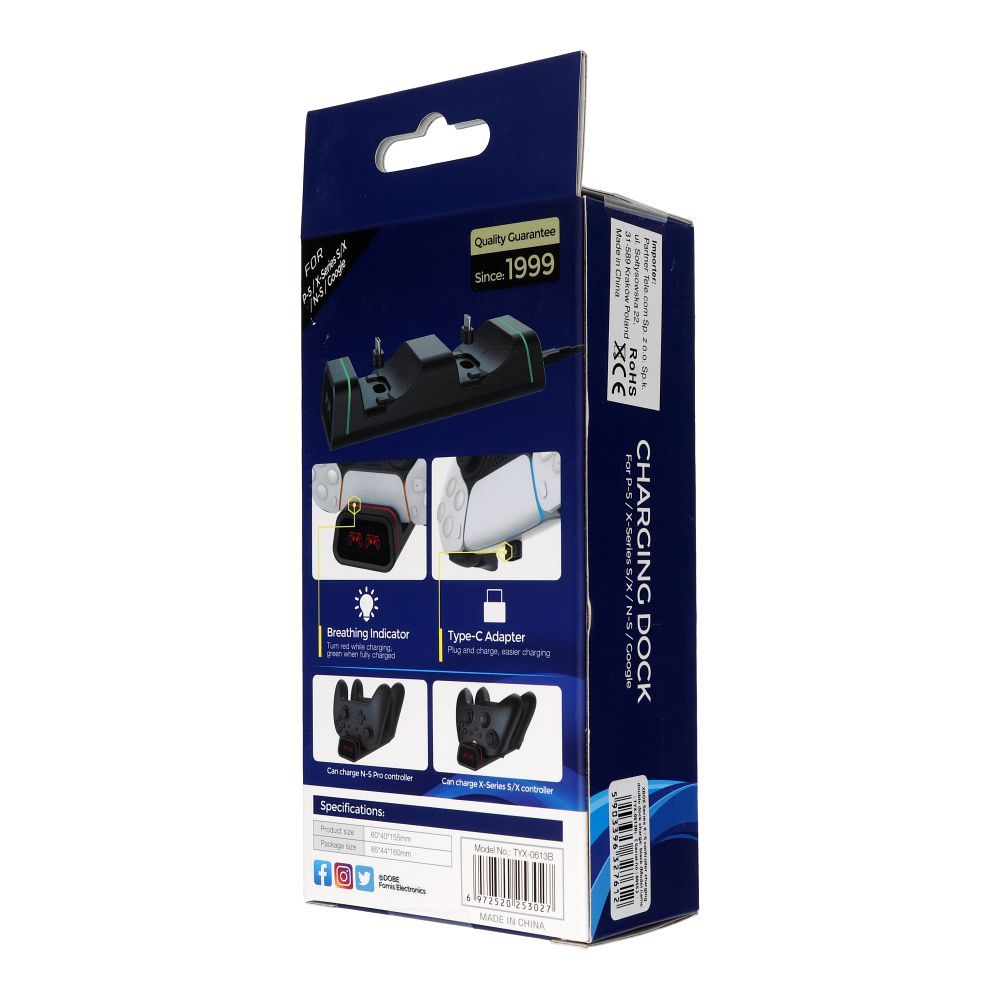Product name: Charger Twin Docking Station for XboxSeriesX/S Model: TYX-0613B Weight:178g Product color: Black Material: ABS Compatible With:XboxSeriesX/S,NSPRO,PS5,Google Cloud Product size:8.3*19*4.3cm Input port: TYPE-C Charging current: 1.5A Charge time:4-4.5H