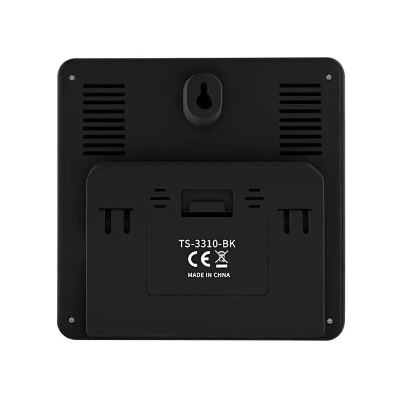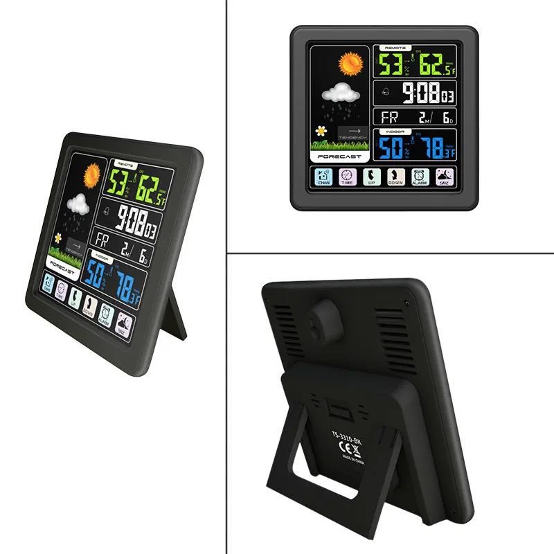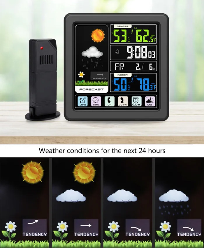 • Kolorowy wyświetlacz LCD z ikonami pogody: słonecznie, częściowo słonecznie, zachmurzenie, deszcz, burza, śnieg.