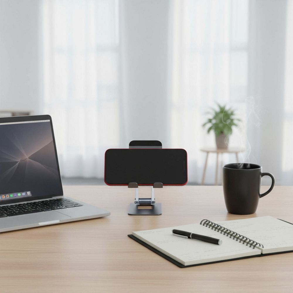 Uchwyt waży zaledwie 85 g, ale dzięki aluminiowej obudowie zapewnia stabilność nawet dla cięższych modeli telefonów – do 600 g. Antypoślizgowe podkładki umieszczone na spodzie gwarantują przyczepność do blatu i zapobiegają przesuwaniu się stojaka podczas użytkowania.