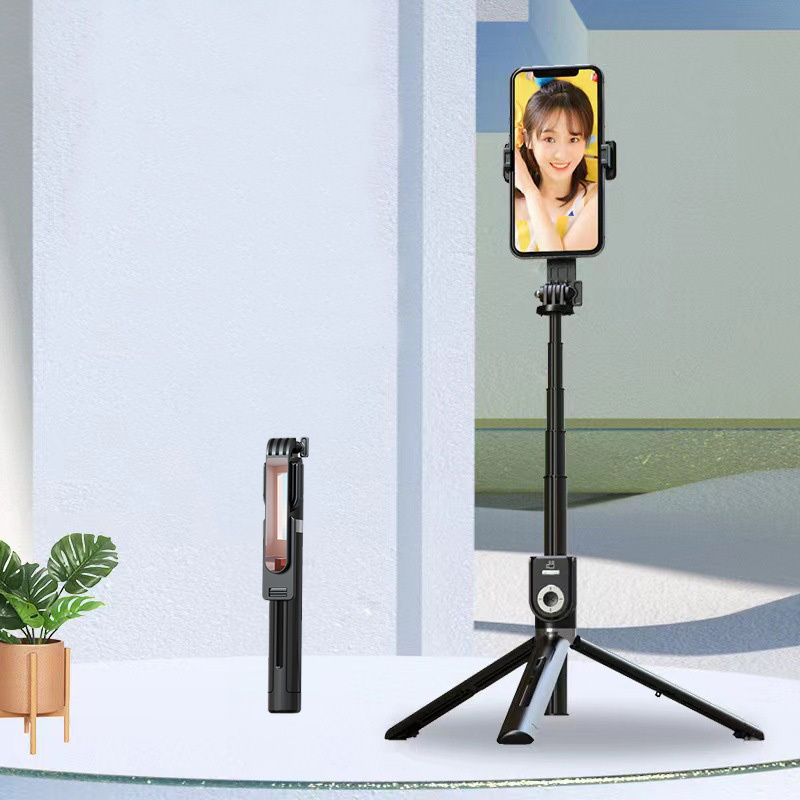 • Uchwyt selfie jest zamocowany na regulowanym tripodzie, który umożliwia dostosowanie wysokości do twoich potrzeb
